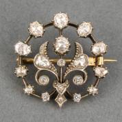 14kt gouden en 1e gehalte zilveren broche gedecoreerd met Franse lelie en bezet met 19 in grootte variërende roos- en oud Europees-slijpsel diamanten, brutogewicht 7,2 gram, Ø 2,75 cm