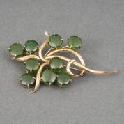 14kt geelgouden takbroche, bezet met negen discvormig geslepen jade, brutogewicht 9,5 gram, 4 x 6,5 cm
