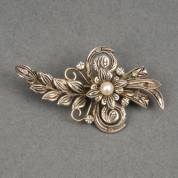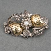 18kt gouden en 1e gehalte zilveren broche bezet met vier roosdiamantjes en een pareltje, brutogewicht 6,2 gram, 2,5 x 4 cm