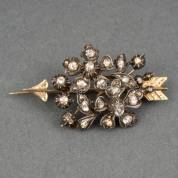 14kt gouden en 1e gehalte zilveren pijl- en bloembroche, rijkelijk bezet met roosdiamanten, brutogewicht 11,2 gram, 3 x 4,75 cm