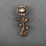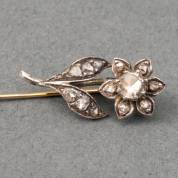 14kt gouden dasspeld in de vorm van een bloem met roosdiamanten in zilver gezet, brutogewicht 2,0 gram, 5,5 cm