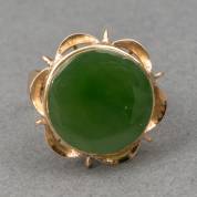 18kt gouden ring met ronde schijf jade, gezet in bloemvormige zetting, mt. 16,5, brutogewicht 4,4 gram