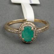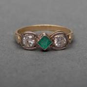 14kt gouden rijring, bezet met carrégeselepen smaragd, aan beide zijden geflankeerd door twee briljantgeslepen diamanten, totaal 0.80ct, mt. 16,25, brutogewicht 2,4 gram