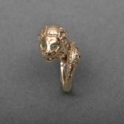14kt gouden pinkring in de vorm van een leeuw, gedecoreerd met ogen van smaragd, de bek bezet met een briljantgeslepen diamant, 0.10ct en het lijf en de staart bezet met diverse diamantjes, mt. 16,5, brutogewicht 8,1 gram