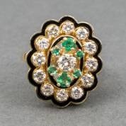 14kt gouden cocktailring, bezet met een entourage van dertien briljantgeslepen diamanten, totaal circa 0.80ct en zes gefacetteerde smaragden, omgeven door een emaille omlijsting, mt. 18,75, gewicht 10,3 gram