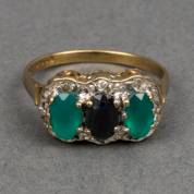 BWGG ring bezet met twee ovaal gefacetteerde smaragden en een saffier, omgeven door tien roosgeslepen diamantjes, gekeurd 9kt, mt. 17, brutogewicht 2,6 gram