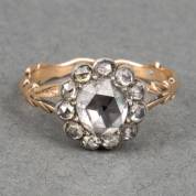 14kt gouden en 1e gehalte zilveren entouragering, bezet met roosdiamanten, middensteen 6mm, omgeven door elf kleinere roosdiamantjes, mt. 17,5, brutogewicht 2,6 gram
