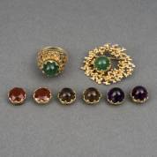 14kt gouden gestileerd vormgegeven ring en broche, voorzien van een schroefmechaniek, waar respectievelijk een carneool, amethist, rookkwarts en groene onyx in gezet kunnen worden, zodat de ring en broche als set kunnen worden gedragen bij diverse outfits, brutogewicht gouden broche en ring 15,6 gram, brutogewicht stenen in gouden zetting 12,0 gram, mt. 17,75, 3,5 x 2,75 cm
