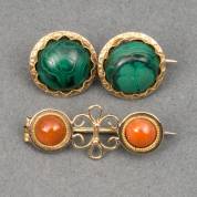 Twee 14kt gouden broches, bezet met twee cabochongeslepen stenen, één met bloedkoraal, ander met malachiet, brutogewicht 7,1 gram, 1,5 x 2,75 cm