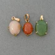 14kt gouden hanger met cabochongeslepen jade, daarbij: twee onedele hangers met cabochongeslepen opaal en kornalijn, brutogewicht 5,9 gram, 1,75 cm