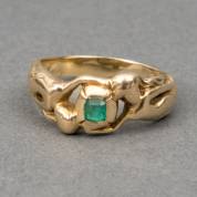 14kt gouden ring in de vorm van twee vrouwfiguren die een kussengeslepen smaragd omarmen, in de scheen met gravering '1902', mt. 18,25, brutogewicht 5,6 gram,