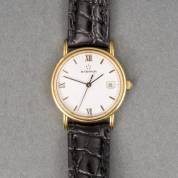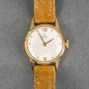 18kt gouden damespolshorloge Omega, zilverkleurige wijzerplaat, aan bruin lederen band, brutogewicht 12,4 gram, Ø 2 cm