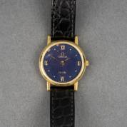 18kt gouden damespolshorloge Omega De Ville, quartz uurwerk, blauwe wijzerplaat, aan zwart lederen band, brutogewicht 17,0 gram, Ø 2,25 cm