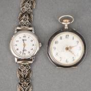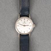 Stalen damespolshorloge Lasita, aan 2e gehalte zilveren bloemgedecoreerde band, en 3e gehalte zilveren damesremontoir met witgeëmailleerde wijzerplaat, kast gezwart en gemonogrammeerd: 'J.R.', brutogewicht 56 gram, Ø 3,25 cm