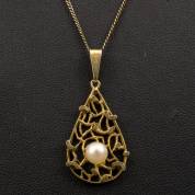 14kt gouden druppelvormige hanger bezet met gecultiveerde parel, aan 14kt gouden gourmetschakelcollier met onedele sluiting, brutogewicht 5,3 gram, 3,3 x 1,75 , 50 cm
