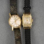 14kt gouden damespolshorloge Omega, en 14kt gouden rechthoekig damespolshorloge, beide mechanisch uurwerk, aan zwart stoffen band, brutogewicht 19,6 gram, Ø 1,75 cm