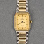 Stalen damespolshorloge Omega De Ville, rechthoekige goudkleurige kast, quartz uurwerk, aan tweekleurige stalen band, 2,25 x 2 cm