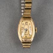 14kt gouden damespolshorloge, mechanisch uurwerk, aan verguld fixoflex rekband, brutogewicht 17,4 gram, 2 x 1,5 cm