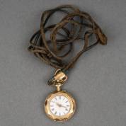 Damesremontoir in 14kt gouden kast, aan lederen draagkoord -scharnier defect-, brutogewicht 19,5 gram, Ø 2,5 cm