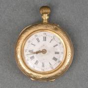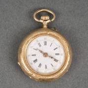 Damesremontoir in 14kt gouden kast, mechanisch uurwerk, de witgeëmailleerde wijzerplaat met Romeinse cijferaanduiding en gouden wijzers, kast fijn gegraveerd met bloemen, brutogewicht 18,8 gram, Ø 2,75 cm