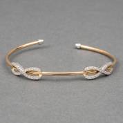 18kt roségouden spangarmband met twee witgouden oneindigheidstekens bezet met diamant, pavé gezet, totaal circa 0.60ct, brutogewicht 6,1 gram, 6,25 x 5 cm
