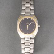 Stalen herenpolshorloge Omega Seamaster, quartz uurwerk, octagonale tweekleurige kast met donkere wijzerplaat, aan stalen schakelband, met aankoopbewijs 1996, en extra schakel, 3,25 x 3,5 cm