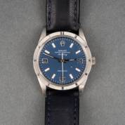 Stalen herenpolshorloge Rolex, model Rolex Air King Oyster Perpetual - Precision, automaat, blauwe wijzerplaat, aan donkerblauwe niet-originele lederen band, Ø 3,5 cm