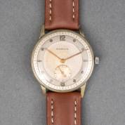 Stalen herenpolshorloge Oris, 17 jewels, automaat, goudkleurig stalen kast en zilverkleurige wijzerplaat, aan bruin lederen band, Ø 3,25 cm