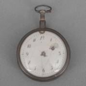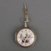 Engels herenvestzakhorloge in dubbele 1e gehalte zilveren kast, de witgeëmailleerde wijzerplaat met beschilderd landschap, snekuurwerk, gesigneerd Samson, Londen, de zilveren kast voorzien van jaarletter 1794, 2 x 5 x 5 cm