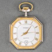 Stalen herenvestzakhorloge, deels verguld, Prisma quartz uurwerk, witte wijzerplaat met datumaanduiding, 5 x 3,75 cm
