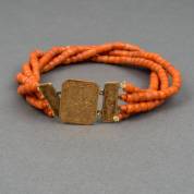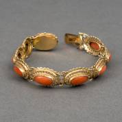 14kt gouden bootjesarmband bezet met ovaal cabochongeslepen bloedkoraal, brutogewicht 19,3 gram, 19 cm