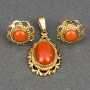 Paar 14kt gouden oorstekers bezet met cabochongeslepen bloedkoraal, daarbij: 14kt gouden hanger met ovaal cabochongeslepen bloedkoraal, brutogewicht 4,0 gram -één poussette onedel-, 3 x 1,25 , Ø 1,25 cm