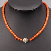Bloedkoralen collier van geregen tonkralen aan 14kt witgouden knoopslot bezet met briljantgeslepen diamantje, 36 cm