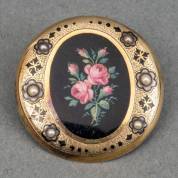 Ronde BWGG broche met bloembeschilderd decor en bezet met zaadpareltjes, brutogewicht 7,2 gram, Ø 2,75 cm