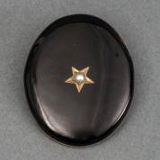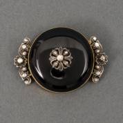 Onyx rouwbroche bezet met pareltje, brutogewicht 12,0 gram, speld en achterplaat onedel, 4 x 3,25 cm
