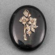 Ovale onyx rouwbroche, ook draagbaar als hanger, voorzijde met gouden bloemenapplique bezet met zaadpareltjes, achterzijde met BWGG fotoframe, brutogewicht 12,8 gram, 3,5 x 2,75 cm