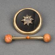 Ronde rouwbroche met BWGG gegraveerde rand en applique bezet met zaadpareltjes, en BWGG cilindervormige broche met twee Bodhi-boompitten en een bloedkoraaltje, brutogewicht 17,6 gram, Ø 3,5 cm