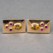 Paar rechthoekige 18kt gouden manchetknopen, handgemaakt, elk bezet met ovaal gefacetteerde citrien en drie robijntjes, brutogewicht 10,4 gram, 2,25 x 1,5 cm
