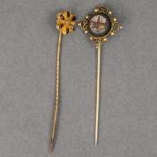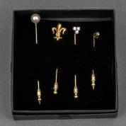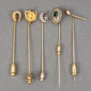 Vijf gouden dasspelden, diverse gehaltes en modellen, waaronder: één bezet met tafelgeslepen smaragd en zaadpareltjes, brutogewicht 16,4 gram, 7,25 cm
