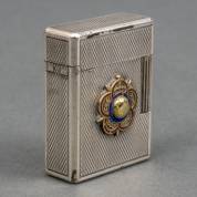Geguillocheerde zilveren aansteker, J.C. Dupont met geëmailleerde gouden applique, brutogewicht 77,4 gram, 4,5 x 3,5 x 1,5 cm