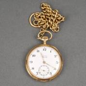 14kt gouden herenvestzakhorloge, adres: G. Brünott, Rotterdam, circa 1900, model Mercedes, Ancre Spiral Brequet uurwerk, witgeëmailleerde wijzerplaat met chronografische secondeaanduiding, geguillocheerde achterdeksel met cartouche, aan 14kt gouden horlogeketting met jasseronschakels, brutogewicht 88,6 gram, in originele cassette -werkend, binnenzijde gegraveerd-, Ø 4,75 cm