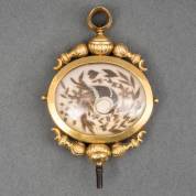 14kt gouden horlogesleutel met gedecoreerde ovale lijst, waarin haarwerk van hoorn des overvloeds aan de ene zijde, de andere zijde gemonogrammeerd: 'K.B. 1815', brutogewicht 19,6 gram, 7,5 x 5 cm