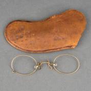 BWGG brilletje in lederen etui, brutogewicht 2,5 gram -glazen manco, defecten-, 3 x 10 cm