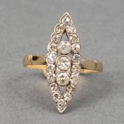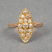 14kt gouden markiesring, bezet met 13 bolsjewiekgeslepen diamanten en twee briljantgeslepen diamanten, totaal circa 0.90ct, mt. 18,25, brutogewicht 2,6 gram