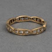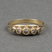 14kt gouden rijring, bezet met vijf zirkonia's, in gladde zetting, mt. 18,5, brutogewicht 1,5 gram