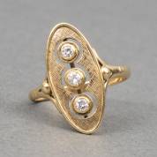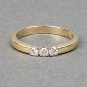 14kt gouden rijring, bezet met drie briljantgeslepen diamanten in witgoud gezet, totaal circa 0.18ct, mt. 16,25, brutogewicht 2,5 gram