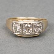 14kt gouden rijring met drie bolsjewiekgeslepen diamanten in witgouden zetting, totaal circa 0.75ct, mt. 18, brutogewicht 4,6 gram