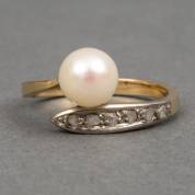 14kt geel- en witgouden slagring, bezet met gecultiveerde parel en zes roosdiamantjes, mt. 17,5, brutogewicht 3,5 gram