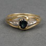 14kt gouden ring bezet met een ovaal gefacetteerde saffier, aan beide zijden geflankeerd door een briljantgeslepen diamantje, mt. 17, brutogewicht 2,1 gram -één diamantje licht beschadigd-