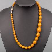 Barnsteen collier, van en chûte geregen eivormige kralen, aan 2e gehalte zilveren bolsluiting, brutogewicht 29,2 gram, 50 cm